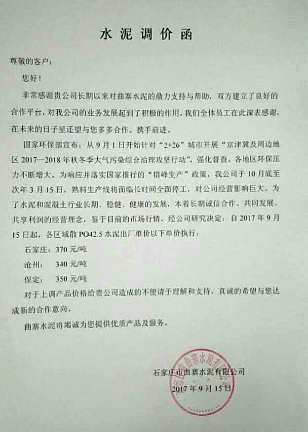 石家庄曲寨水泥的调价通知称:国家环保部宣布从9月1日开始针对“2+26”城市开展“京津冀及周边地区2017-2018年秋冬季大气污染综合治理攻坚行动”,强化督查。各地区环保压力不断增大。
