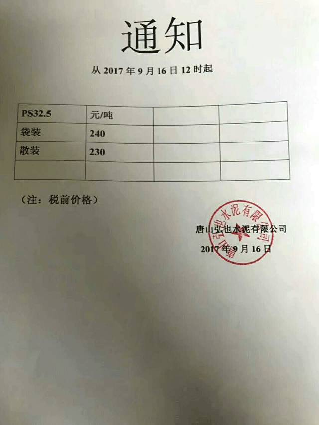 经研究讨论,自2017年9月14日零时起,对金隅鼎鑫、赞皇金隅、灵寿冀东、临港金隅、深州冀东各厂生产的产品价格统一上调,调整后执行价格为: