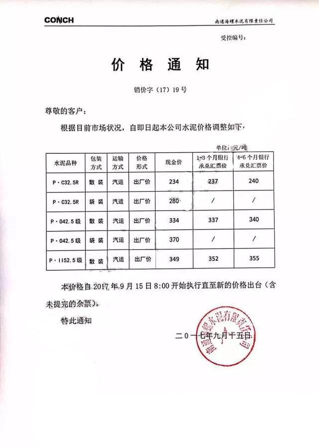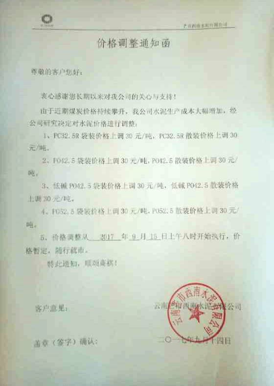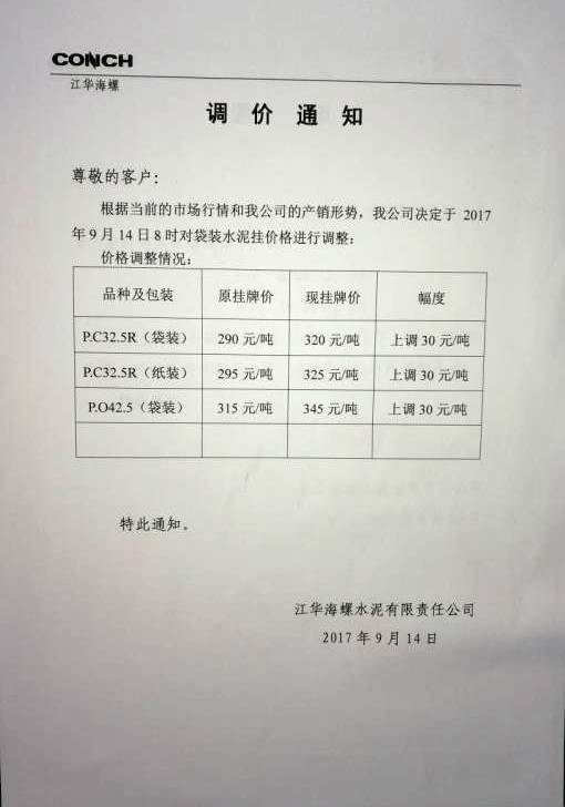 实现普涨,其中低标袋、散装水泥上涨15元/吨,高标袋、散装上调幅度30元/吨;