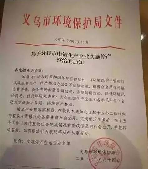 浙江省又开始了新一轮严酷的环境保护治理与整顿,于2017年8月14日下发正式文件,“依据《中华人民共和国环境保护法》、《环境保护主管部门实施限制生产、停产整治办法》等法律法规,为降低环境风险隐患,责令电镀生产企业实施停产整治,在十五个工作日内将整改任务完成情况和整改信息向社会公开。”