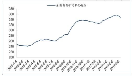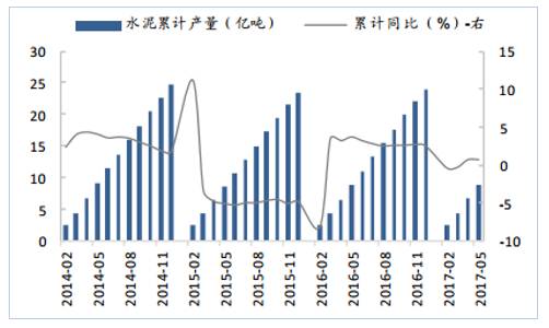 【水泥人网】2017 年延续去年底以来的良好势头,需求仍有支撑、价格维持高位,总体表现可圈可点: 1-5 月水泥产量 8.9 亿吨,同比增长 0.7%, 与去年同期基本持平。价格表现分化, 水泥价格持续攀升至 5 月中旬达到顶峰 355 元/吨,较年初涨幅达20.5%, 近期受多地降雨增多影响,需求整体下滑, 价格应声回落呈弱势运行, 但仍维持相对高位,且目前夏季停窑地区明显增多,一定程度稳定了淡季市场。
