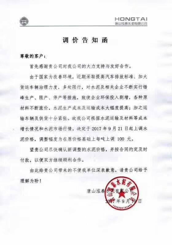 唐山冀东水泥价格调整告知函称:近期受国家加强大气污染治理影响,货物运输车辆排放标准上调,货物运输受限明显,交通运输费用大幅上涨,造成石灰石、矿渣等原材料价格也大幅上扬,同时受国家供给侧改革持续推进,水泥企业错峰生产成为长效机制影响,水泥生产成本大幅增加,企业经营困难 ,为保证企业良性发展,持续为客户提供优质产品和良好服务,根据当前市场情况,自2017年9月22日起将水泥价格上调100元/吨。