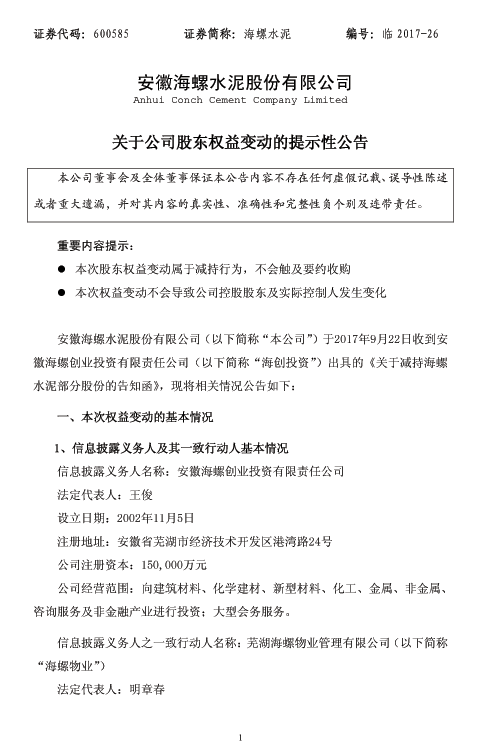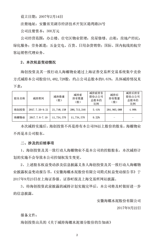 【水泥人网】海螺水泥昨日(22日)晚间公告,海创投资及其一致行动人海螺物业以集中竞价方式减持公司股份33,482,728股,约占公司总股本的0.63%。 海创投资于2017.7.20-9.21期间,累计减持21,748,158股,减持后持股占比4.99%,不再是持股5%以上股东。 海螺物业于2017.7.6-7.19期间累计减持11,734,570股,减持后已不再是公司股东。公告原文如下: