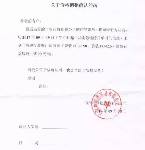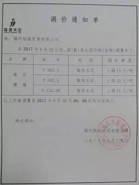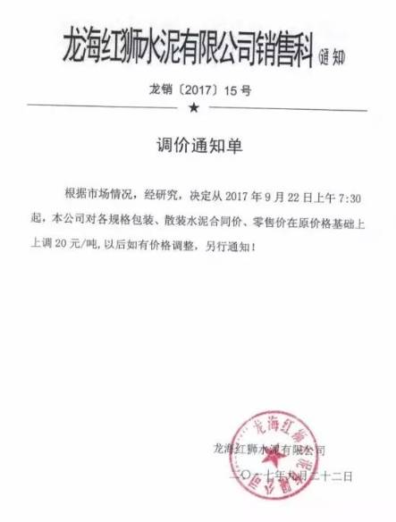 根据目前市场行情,经公司研究决定 ,自2017年9月22日零时起,我司发往福建省内各区域的袋、散水泥的出厂价在原来的价格基础上上调20元/吨。熟料同步上调20元/吨。