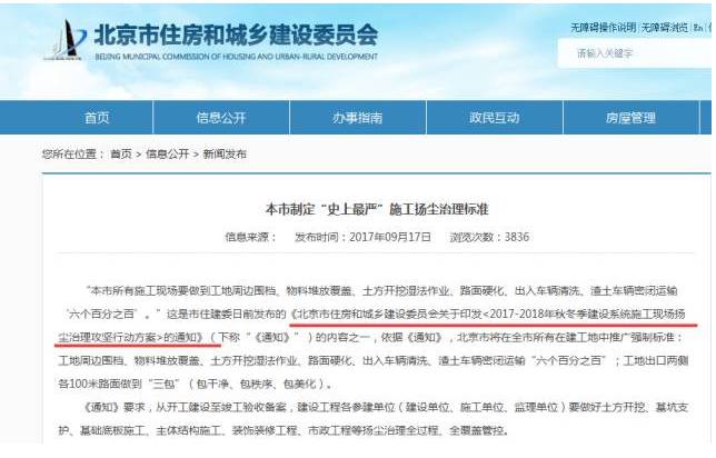 北京要求,城六区及10个新城区的各类道路工程、水利工程、土石方作业和房屋拆迁施工等全面停工,停工4个月(2017年11月15日至2018年3月15日)。对拒不停工项目、扬尘不达标等项目,将暂停相关单位的投标资格。