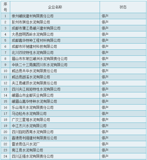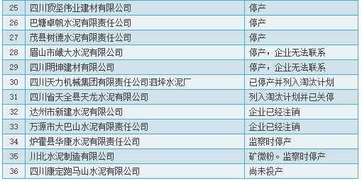 四川省工信委对全省水泥行业企业执行的国家强制性能耗限额标准情况专项监察结果显示:四川省共有36家企业处于停产状态,其中27家处于完全停产状态,2家企业处于停产,无法联系状态;2家列入淘汰计划并已关停;2家企业已注销;2家企业监察时停产,一家企业尚未投产。