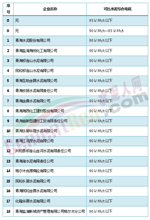 青海省共提了18家水泥企业的可比水泥综合电耗数据,相关数据显示18家企业可比水泥综合电耗均处于90 kWh/t以下。相关公示提到格尔木市启亮工贸有限责任公司处于非正常生产状态,无法核算电耗数据;青海强通水泥有限公司生产经营相关证明文件不完整,未完整提供生产能耗报表、原始记录、财务凭证等,无法核算电耗数据。