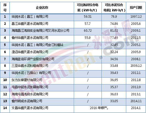 全省被列入核查的水泥企业14家,其中文昌华盛天涯水泥有限公司因2016年度停产未开展核查外,其他13家企业均配合完成了核查任务。2016年,全省13家水泥企业共生产熟料1510万吨、水泥2182万吨,用电量合计16.8亿千万时。