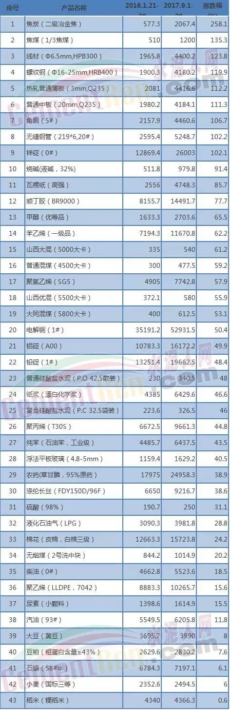 从国家统计局发布的相关数据来看,自2016年初以来,大部分产品价格都出现了不同程度上涨,其中涨幅最大的是焦炭(二级冶金焦),涨幅达258.1%。由此可以看出,在目前的经济环境之下,并不是水泥在涨,而是各个领域的大宗商品都在涨。