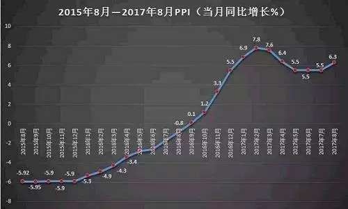 供给侧改革的主要手段就是以去产能、去库存、去杠杆、降成本、补短板。在供给侧改革的大背景之下,首先遭到打击的是房地产行业,其次就是各个大宗商品,各大行业的寡头企业减少了市场供给量,造成一定的市场需求缺口。价格自然而然会飙涨。 以焦炭为例。焦炭1801合约在2016年1月,曾经跌到558元,此后飞速上涨,到2017年8月,已经涨到了2500元的上方达到2502.5,涨幅高达348%还多。由此导致的结果是,PPI的飞速上涨。如下图所示,PPI几乎是一路高歌。