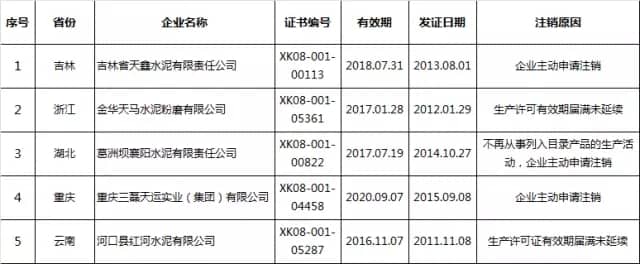 昨日(10日),国家质检总局在其官网公布了已注销吉林省天鑫水泥有限责任公司等6056家企业工业产品生产许可证,其中含水泥企业五家。分别为: