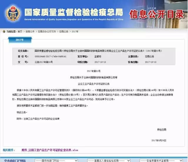 质检总局公告称: 因不再从事列入目录产品的生产活动、生产许可有效期届满未延续、企业主动申请注销等原因,质检总局已注销中国国际钢铁制品有限公司等6056家企业工业产品生产许可证,并将名单予以公布。