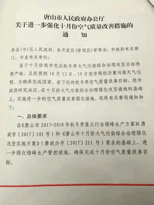 昨日(11日),唐山市人民政府办公厅发布关于进一步强化十月份空气质量改善措施的通知(以下简称“通知”)。