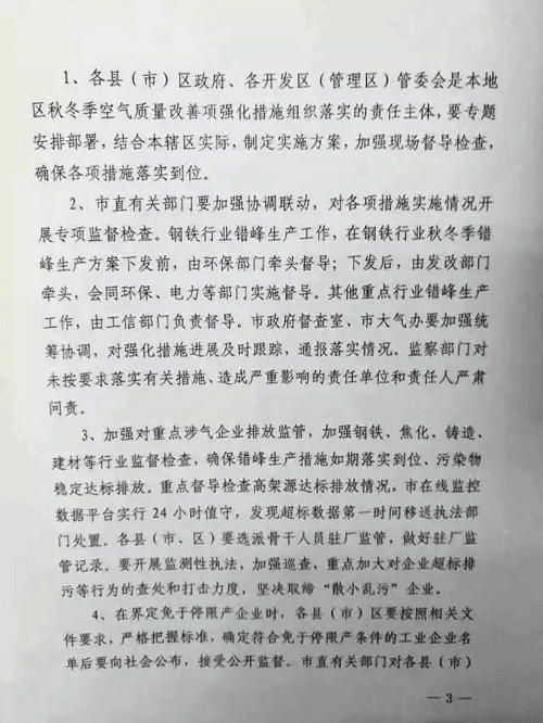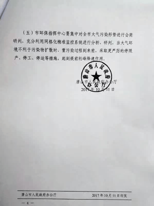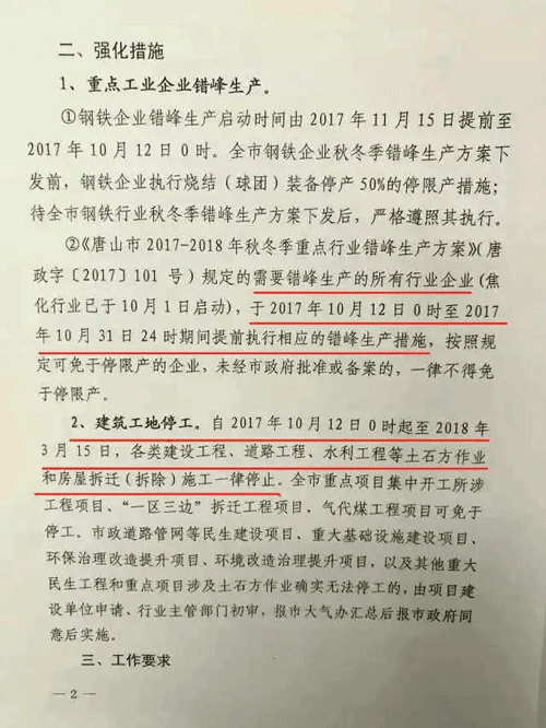 通知要求《唐山市2017-2018年秋冬季重点行业错峰生产方案》(唐政字[2017]101号)规定的需要错峰生产的所有行业企业,于2017年10月12日0时至2017年10月31日24时期间提前执行相应的错峰生产措施,按照规定可免于停限产的企业,未经市政府批准或备案的,一律不得免于停限产。