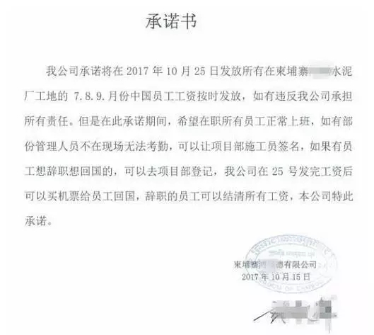 承诺书称,将在10月25日发放所有在工地的中国员工7、8、9月份的工资,并希望在此之前工人们都能正常上班。
