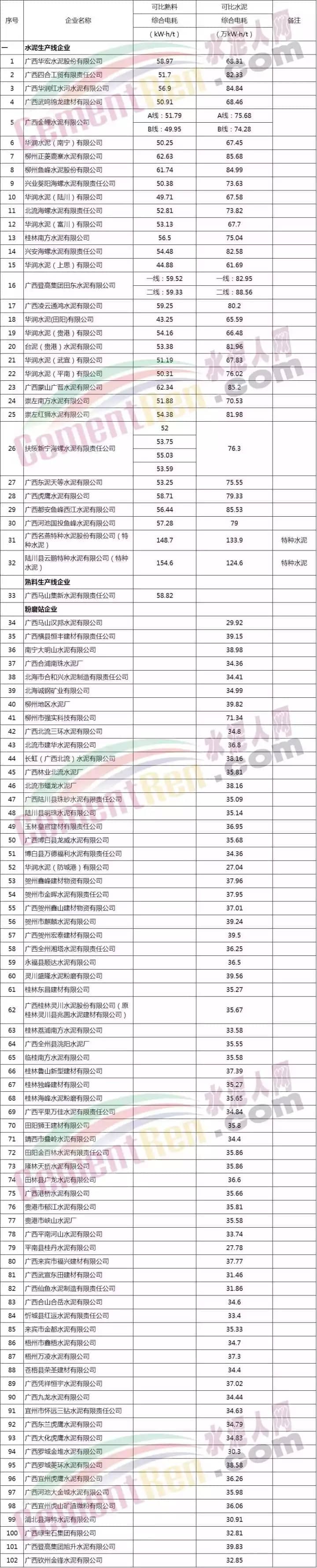 根据《广西壮族自治区物价局工业和信息化委员会转发国家发展改革委 工业和信息化部关于水泥企业用电实行阶梯电价政策有关问题的通知》(桂价格〔2016〕22号),我委委托自治区节能监察中心对我区水泥生产企业单位产品能耗限额进行了专项监察,现将2016年我区水企业可比综合电耗专项检查结果予以公布,此次公布企业数达115家,其中10家已停产水泥企业没有相关数据,1家已破产企业。 104家水泥企业可比综合电耗表 破产及停产水泥企业名单