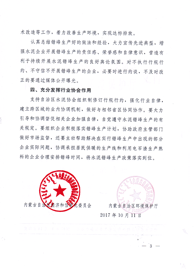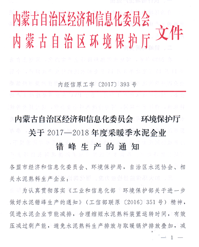 近日,内蒙古自治区经信委联合内蒙古环保厅发布《关于2017-2018年度采暖季水泥企业错峰生产的通知》。通知称:为认真贯彻落实《工业和信息化部 环境保护部关于进一步做好水泥错峰生产的通知》精神,促进水泥企业节能减排,合理缩短水泥熟料装置运转时间,有效压减过剩产能,避免水泥熟料生产排放与取暖锅炉排放叠加,减轻采暖期大气污染,经研究决定,对2017-2018年度采暖季水泥企业(含利用电石渣)做如下安排,认真贯彻执行。