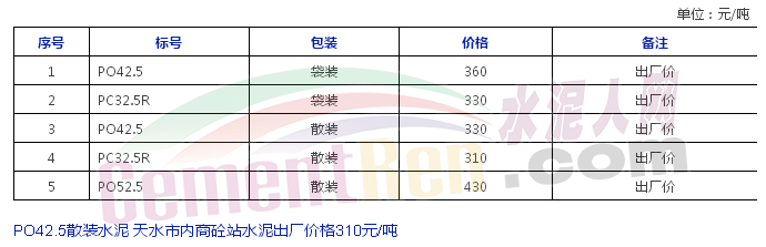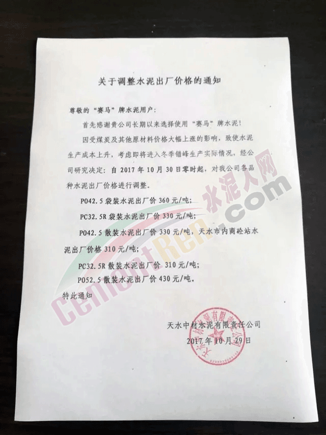 水泥人网29日消息,中建材下属企业天水中材水泥有限责任公司自今日零时起,对各品种水泥出厂价格进行调整。调整后各品种水泥执行价格如下: 调价通知 调价通知称:因受煤炭及其他原材料价格大幅上涨的影响,致使水泥生产成本上升,考虑即将进入冬季生产实际情况,经研究决定自今日(30日)零时起,对公司各品种水泥出厂价格进行调整。