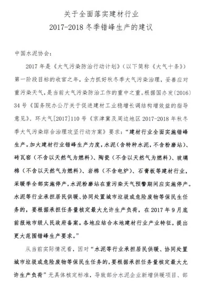 最新消息,河南省建材协会、山西省建材协会、河北省建材协会、山东省水泥协会、陕西省水泥协会、湖北省水泥协会等6家水泥协会及金隅冀东水泥、河北曲寨水泥、武安新峰水泥、山西威顿水泥、山东山水水泥集团、淄博联合水泥、葛洲坝水泥集团、京兰水泥集团、世纪新峰水泥、焦作千业水泥、河南春江水泥、河南大地水泥、河南泰隆水泥、河南孟电水泥、河南嵩基水泥、河南湖波水泥、河南天瑞集团、河南同力水泥、山东泉兴集团、中国联合水泥等20家水泥集团企业联合向水泥协会发出《关于全面落实建材行业2017-2018冬季错峰生产的建议》函,建议函由以上6地区水泥建材行业协会和18家水泥集团企业共同签字。