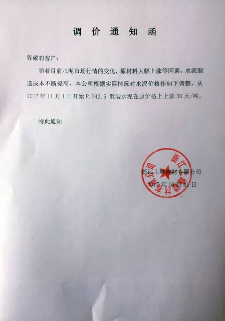 南方水泥在华东江浙沪一带为主导生产企业,这一波由南方水泥领涨,后期区域内相关生产企业陆续跟涨。10月31日上峰水泥也发布调价通知,通知称自11月1日开始P.O42.5散装水泥在原价格基础上上涨30元/吨。