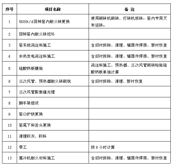 一、投标内容:窑耐火材料检修,具体项目如下: