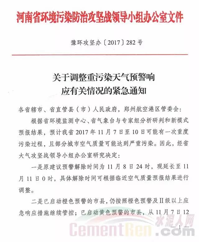 本次通知文件明确“原建议预警解除时间为11月8日24时,现延长至11月11日0时,具体解除时间可根据临近空气质量预报结果进行调整。”,考虑到费用支出,节能降耗减排问题。省内部分熟料生产线企业表示将会把此次重污染天气管控停产与2017-2018年采暖季错峰生产一并执行,复产日期延期至2018年3月15日。
