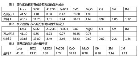 某厂生料配比采用钙铁控制,控制指标是CaO:38.83%、Fe2O3:2.74%,生料目标值为KH:0.97;SM:1.85;IM:1.20。原料配比不变,“表1”是变化前的石灰石成分和对应的生料成分,“表2”是变化后的石灰石成分和对应的生料成分,可见由于石灰石成分变化,生料成分和率值发生很大变化。根据氧化钙和三氧化二铁的控制指标进行原料配比调整,“表3”是调整后的生料成分和率值,可见氧化钙和三氧化二铁符合控制指标要求,生料三率值并不符合目标值要求,主要原因是二氧化硅和三氧化二铝发生了大幅度的变化。