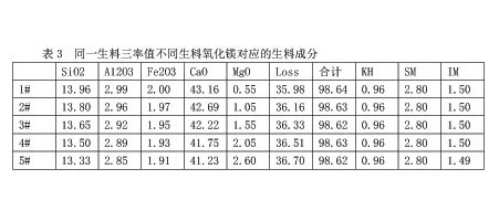 “表3”是同一生料三率值,不同生料氧化镁对应的生料成分和率值,5组数据的三率值相同,氧化镁不同,三氧化二铁无很大变化,氧化钙变化很大,数据表明:当生料三率值不变时,不同生料氧化镁对应不同的生料氧化钙,钙铁控制法的关键是保证石灰石氧化镁稳定,如果无法保证石灰石氧化镁稳定,必须同时测定出磨生料的氧化镁,及时调整出磨生料氧化钙的控制指标。
