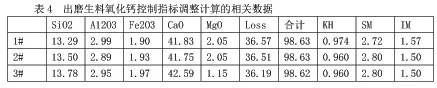 已知生料三率值的目标值是KH:0.960;SM:2.80;IM:1.50;出磨生料的氧化镁是1.15,“表4”是出磨生料氧化钙控制指标调整计算的相关数据,1#是出磨生料最新的化学分析数据,2#是计算的出磨生料标准成分,3#是计算的出磨生料氧化镁标准成分,41.75和1.93分别是氧化镁在2.05条件下的氧化钙和三氧化二铁的控制指标,42.59和1.97分别是氧化镁在1.15条件下的氧化钙和三氧化二铁的控制指标。
