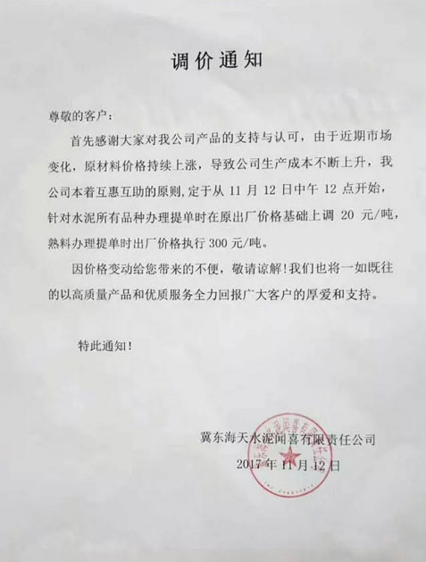 冀东海天水泥闻喜有限责任公司调价通知:由于近期市场变化,原材料价格持续上涨,导致公司生产成本不断上升。本着互惠互助的原则,定于11月12日中午12点开始针对水泥所有品种办理提单时在原出厂价格基础上上调20元/吨,熟料办理提单时出厂价格执行300元/吨。
