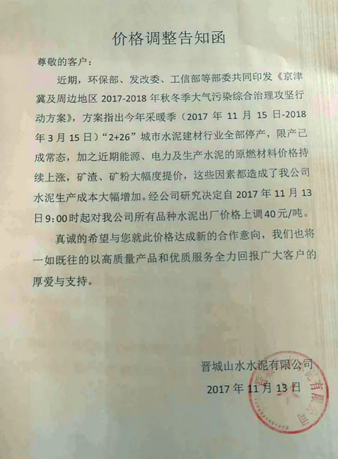 晋城山水水泥提价通知:近期,环保部、发改委、工信部等部委共同印发《京津冀及周边地区2017-2018年秋冬季大气污染综合治理攻坚行动方案》,方案指出今年采暖季(2017年11月15日-2018年3月15日)“2+26”城市水泥建材行业全部停产,限产已成常态,加之近期能源、电力及生产水泥的原燃料材料价格持续上涨,矿渣、矿粉大幅度提价,这些因素都造成了我公司水泥生产成本大幅增加。经公司决定自2017年11月13日9点对公司所有品种水泥出厂价格上调40元/吨。