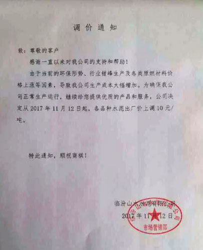 临汾山水水泥有限公司提价通知:由于当前的环保形势、行业错峰生产及各类原燃格上涨等因素,导致我公司生产成本大幅增加,为确保公司正常生产运行,继续为客户提供优质的产品和服务,公司决定从2017年11月12日起,各品种水泥出厂价上调10元/吨。