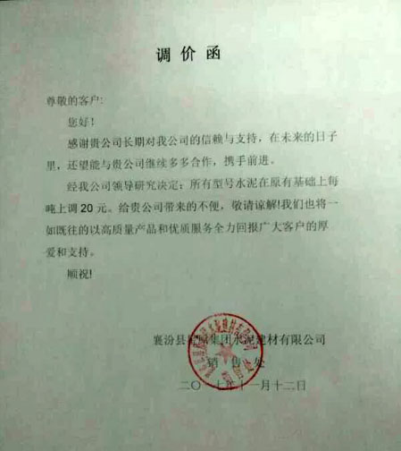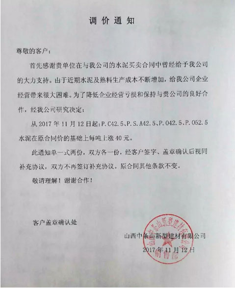 山西中条山新型建材有限公司提价通知:由于近期水泥及熟料生产成本不断增加,给企业经营带来很大困难。为了降低企业经营亏损和保持与客户的良好合作,经研究决定从11月12日起对各品种水泥在原合同价的基础上每吨上涨40元。