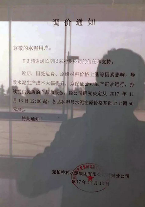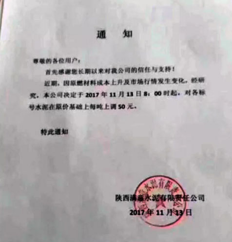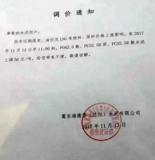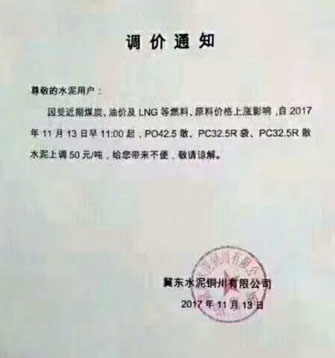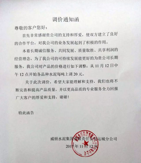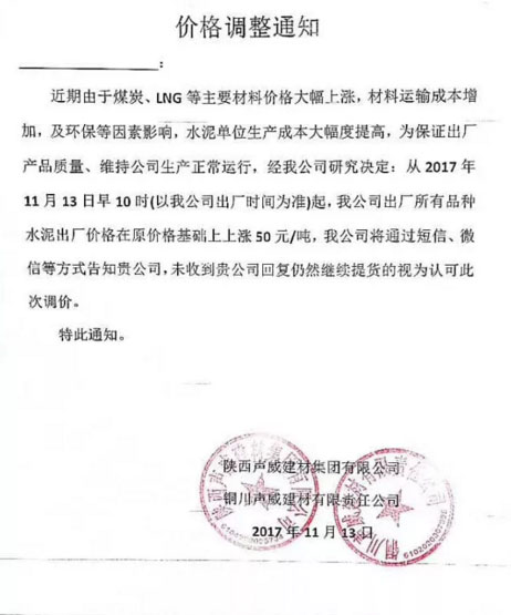 陕西声威建材集团有限公司铜川声威建材有限责任公司提价通知:由于近期煤炭、LNG等主要材料价格大幅上涨,材料运输成本增加及环保等因素影响,水泥单位生产成本大幅度提高,为保证出厂产品质量,维持公司生产正常运行,经研究决定,从2017年11月13日早10点起所有品种水泥出厂价格在原价格基础上上涨50元/吨。