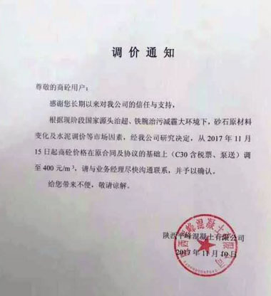 陕西平峰混凝土有限公司提价通知:根据现阶段国家源头治超、铁腕治污减霾大环境下,砂石原材料变化及水泥调价等市场因素,经公司研究决定从2017年11月15日起商砼价格在原合同及基础上(C30含税票、泵送)调至400元/立方。