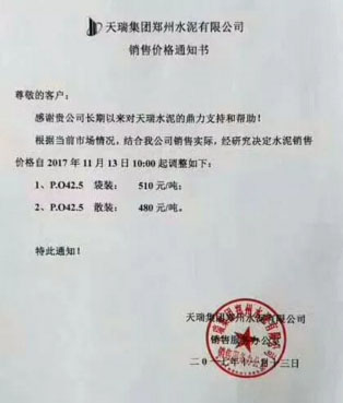 天瑞集团郑州水泥有限公司销售价格通知:根据当前市场,结合公司销售实际,经研究决定水泥销售价格自2017年11月13日起调整为:P.O42.5袋装510元/吨;P.O42.5散装480元/吨。