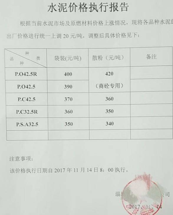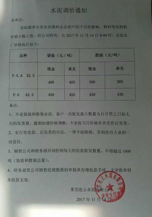 2、 青岛地区目前主流品牌P.O42.5散装水泥厂家报价为460-480元/吨;后续水泥价格仍有涨势,预计于11月18日前再次上调90元/吨。