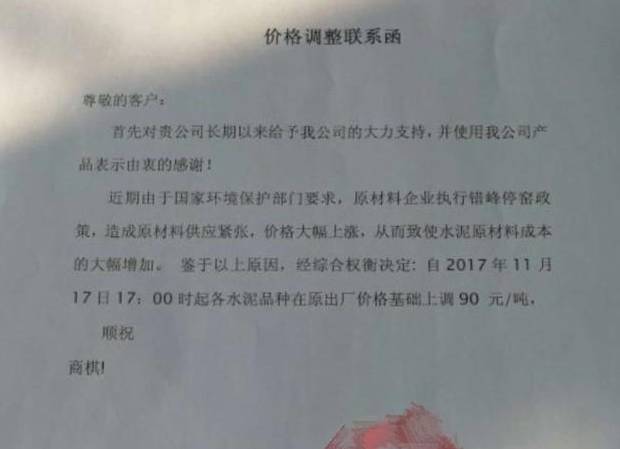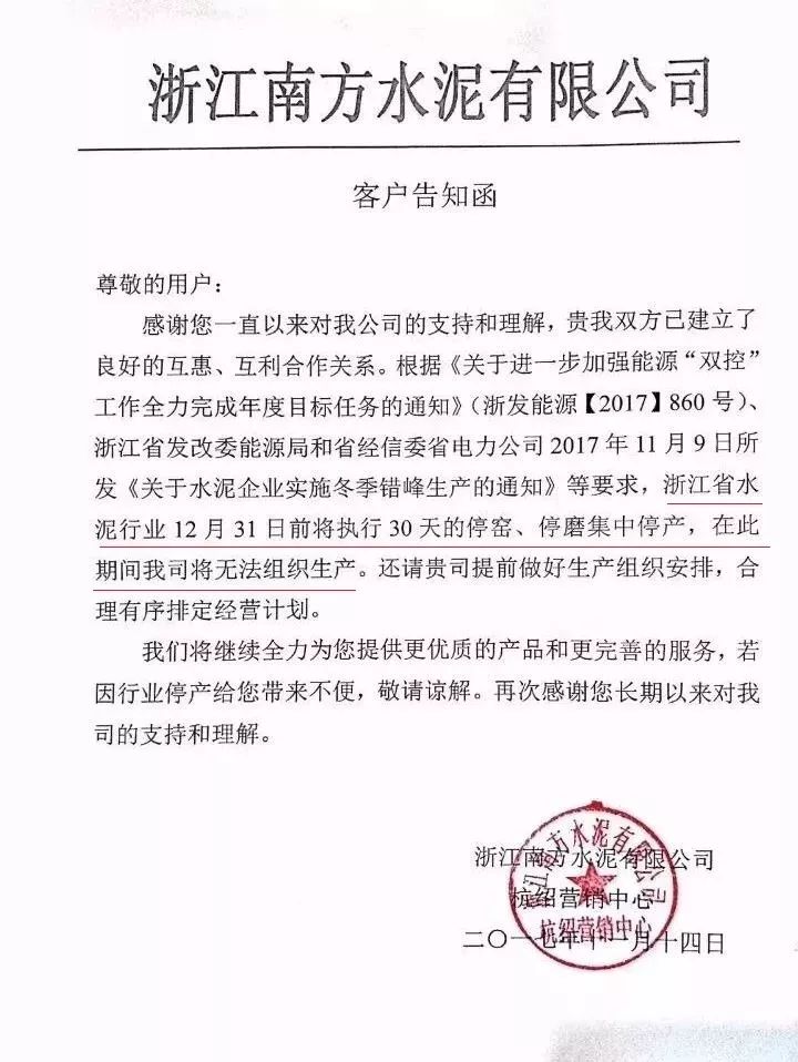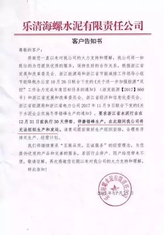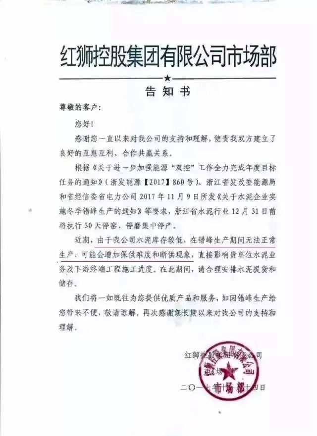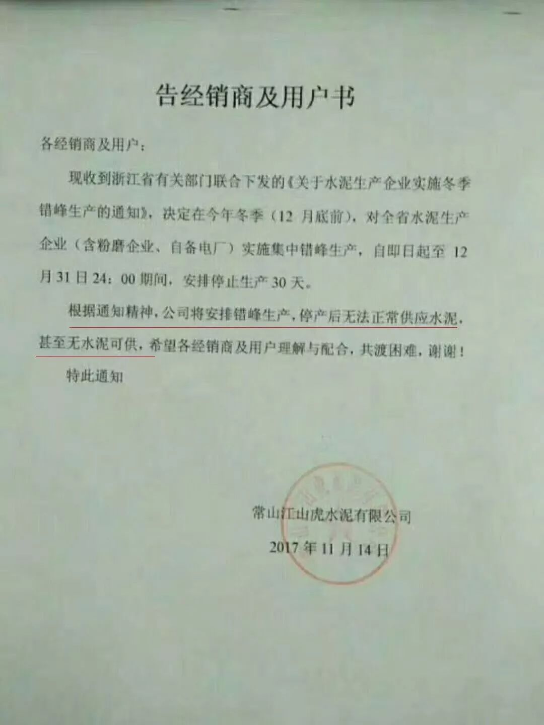 受此影响,华东浙江主导企业南方水泥、红狮水泥、海螺水泥等企业向下游客户发布告函称:受区域错峰生产影响,将无法保证正常水泥供应,后期有可能断货停供。