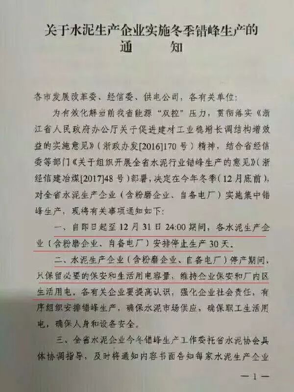1 自即日起至12月31日24时期间,各水泥生产企业(含粉磨企业、自备电厂)安排停止生产30天。