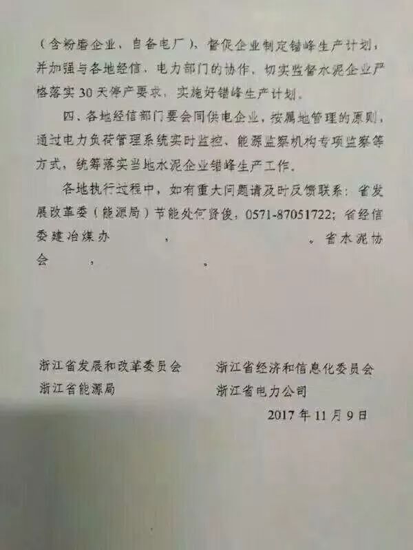 据水泥人网了解,近期浙江省发改委、浙江省能源局、浙江省经委、浙江省电力公司等联合发布《关于水泥生产企业实施冬季错峰生产的通知》称:为有效化解当前浙江省能源“双控”压力,贯彻落实《浙江省人民政府办公厅关于促进建材工业稳定增长调结构增效益的实施意见》精神,结合省经信委等部门《关于组织开展全省水泥行错峰生产的意见》部署,决定在今年冬季(12月底前)、对全省水泥生产企业实施集中错峰停产。