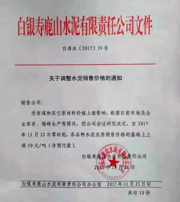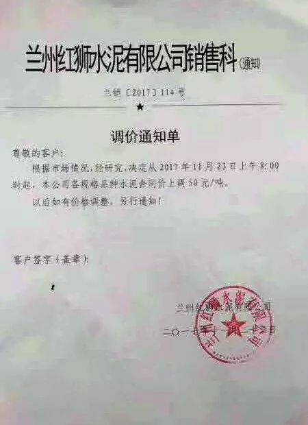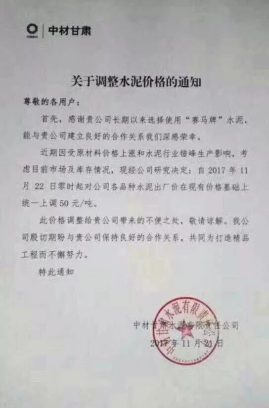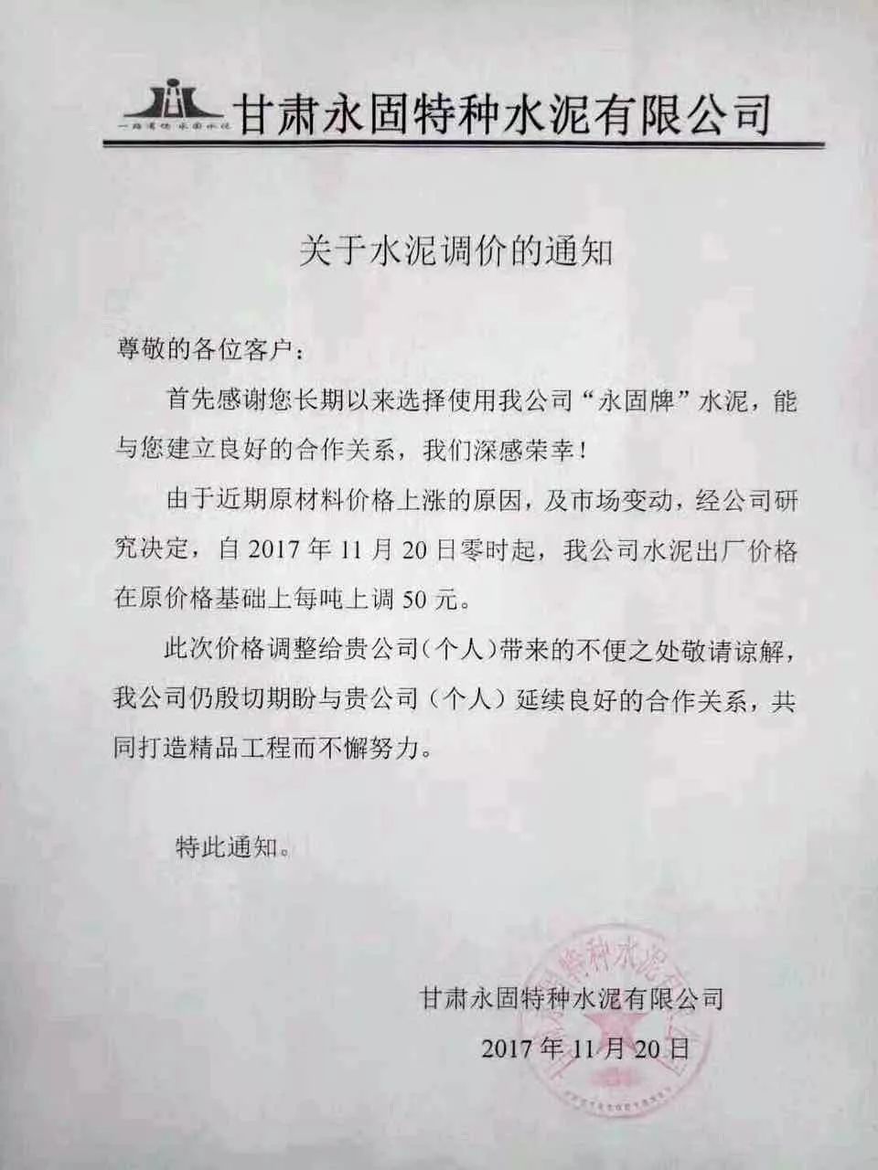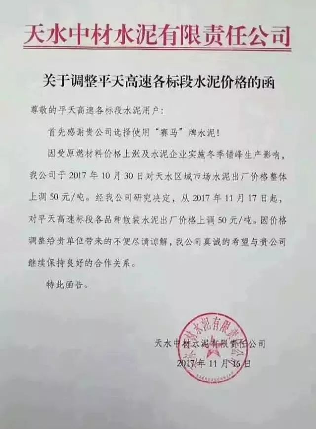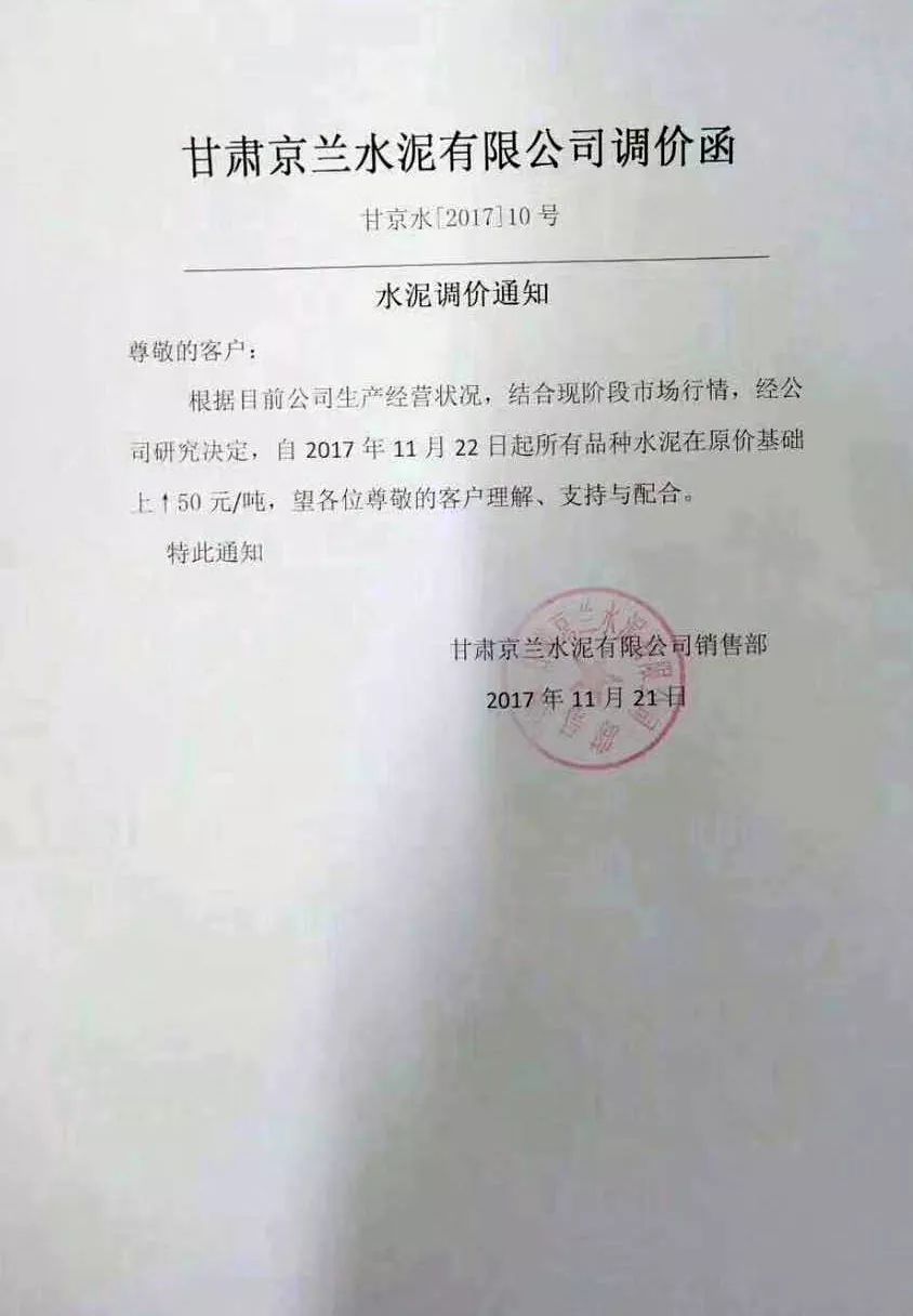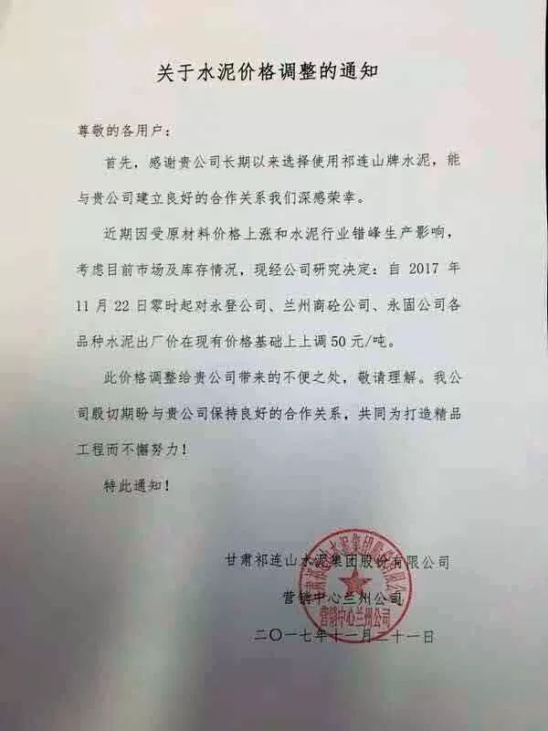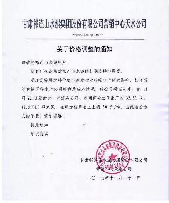 甘肃祁连山水泥集团股份有限公司营销中心天水公司关于调整平天高速水泥价格的通知称,由于受原燃材料价格大幅上涨和水泥企业错峰生产的影响,公司已于2017年10月30日对天水区域市场各品种水泥出厂价格上调50元/吨。经研究决定从2017年11月17日起,对平天高速各用户各品种水泥出厂价格上调50元/吨。