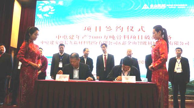 10月底,在台儿庄古城隆重召开的“高效节能绿色环保砂石骨料高峰论坛暨院士工作站启动典礼及项目签约仪式”上,中电建安徽长九新材料股份总经理肖光彩与鑫金山机械董事长孙中岩举行了签约仪式。笔者注意到,接过对方签约函的那一瞬间,孙中岩的眼神充满欣喜,表情自信而坚定。