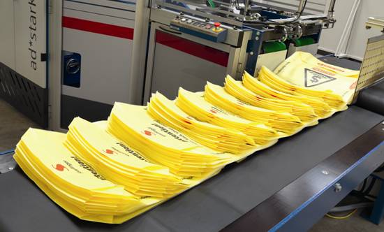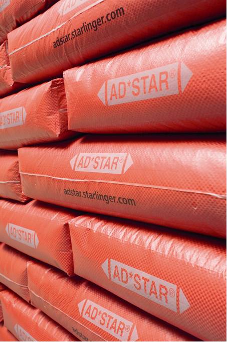 AD*STAR袋已被开发用于优化现代水泥生产:可提高水泥的生产效率和可持续性,减少产品损失,使工作环境更加健康。二十世纪九十年代中期,史太林格奥地利有限公司已经获得这项技术的专利,材料的特性首先决定了AD*STAR袋的牢固性和耐用性。其次起决定作用的就是特殊的生产工艺。它从挤出的聚丙烯扁丝开始,通过拉伸和定型获得强力和延伸性。然后扁丝被织成筒布,并在外面涂覆一层聚丙烯涂膜。涂层的平均厚度为20UM,涂层持久耐用,保证了袋子的密封性,由此防止物体受潮以及隔绝其他外部影响。与缝底袋最大的不同在于制袋工艺,涂膜后的聚丙烯扁丝编织筒布被放置在专门研发的制袋机上,对筒布施加热空气和压力。热空气首先软化聚丙烯涂膜层,然后阀口,顶贴和底贴被固定在被折叠的袋子底部并进行冷却。这过程生产出紧密,结实,耐用的方底阀口袋。袋子的形状可以是方底开口袋,普通阀或口袋阀袋子,也可以根据实际需求调整袋子的形状。制袋机配备电磁输送系统,防止用来包装产品的布料出现小孔,使产品完全密封。在填充高排气性要求货物时,可以使用通过微打孔单元处理的袋子,在具备高透气性的同时保证了货物的零损漏。如今,全球150家工厂每年生产超过80亿只AD*STAR袋。