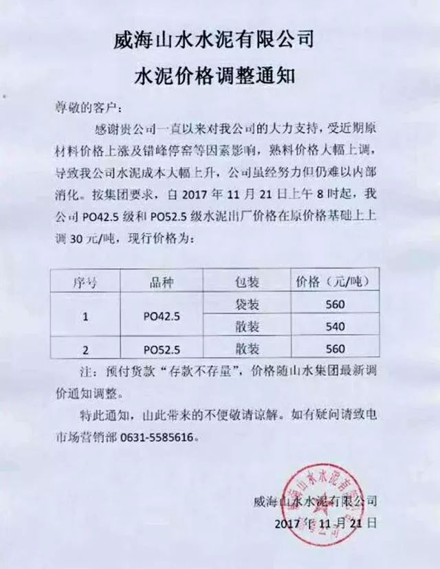 【水泥人网】近日,山东省的水泥熟料价格大涨,多家企业通知下游客户价格上调。其中威海山水水泥有限公司水泥价格调整通知称,受近期原材料价格上涨及错峰停窑因素影响,熟料价格大幅上调,导致公司水泥成本大幅上升。公司虽经努力但仍难以内部消化。按集团要求自2017年11月21日上午8时起,PO42.5级和PO52.5级水泥出厂价格在原价格基础上上调30元/吨。现行价格PO42.5水泥袋装价格560元/吨,散装价格540元/吨。PO52.5散装水泥560元/吨。