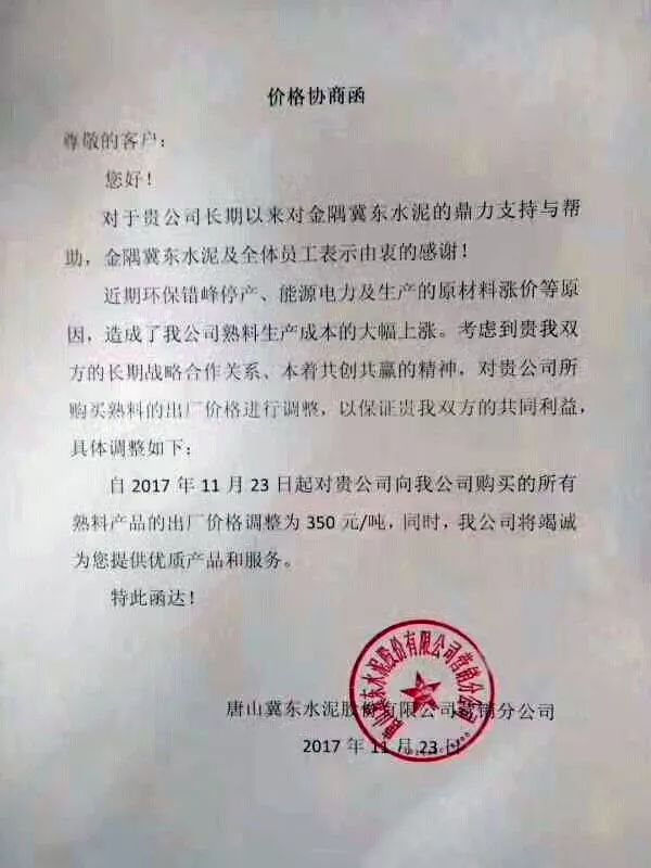 河北省主导企业唐山冀东水泥于昨日发布了熟料价格协商函,《价格协商函》称因近期环保错峰停产、能源电力及生产的原材料涨价等原因,造成了公司熟料生产成本的大幅上涨。考虑到长期战略合作关系,本着共赢的精神,自23日起熟料出厂价格上调为350元/吨 。