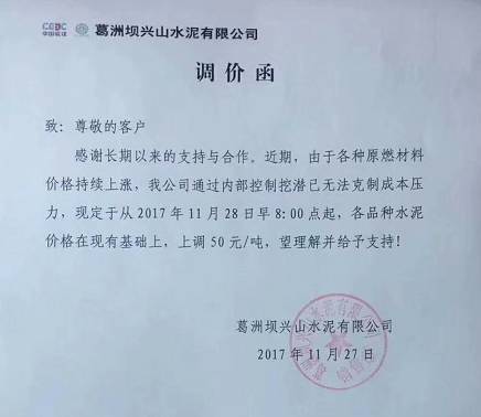 2017年11月28日早8:00起,各品种水泥在原价格基础上,上调50元/吨。