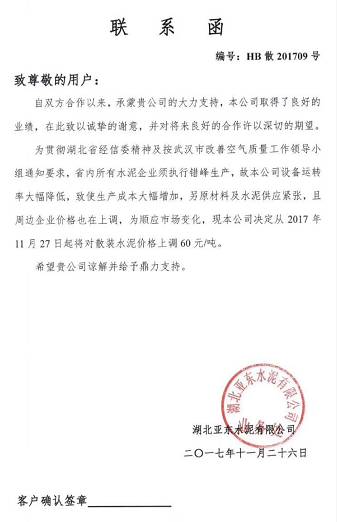 2017年11月27日起,将对散装水泥价格上调60元/吨。
