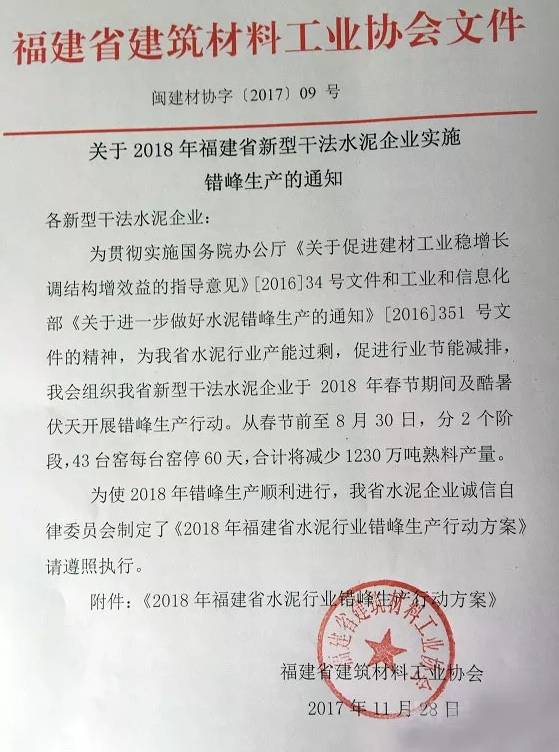 通知称,为贯彻实施国务院办公室厅《关于促进建材工业稳增长调结构增效益的指导意见》的精神,为福建省水泥行业产能过剩,促进行业节能减排,福建省建筑材料工业协会将组织省内新型干法水泥企业于2018年春节期间及酷暑伏天开展错峰生产行动。