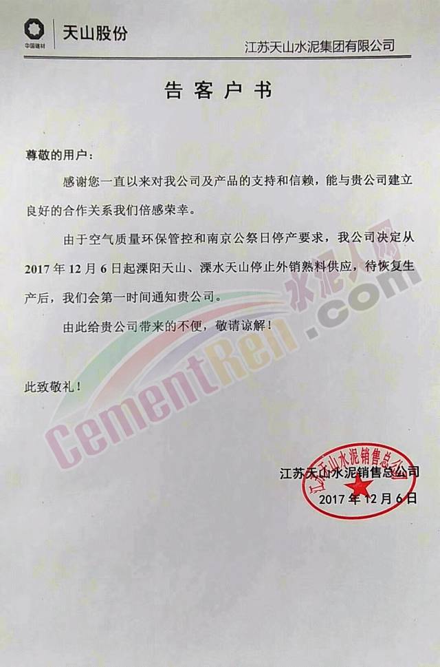 昨日,江苏天山水泥销售总公司发通知称:由于空气质量环保管控和南京公祭日停产要求,公司决定从2017年12月6日起溧阳天山、溧水天山停止外销熟料供应。