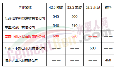 停限之后南京市本地水泥的出货量锐减,水泥价格也出现一定的波动。截止小编发稿时止,南京市主导企业的PC32.5水泥,PO42.5水泥报价皆在500元以上。具体报价见下表: